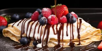 Unlimited servings of freshly made crepes with a delightful selection of sweet fillings. Choose from classics like maple & golden syrup, lemon & sugar, and cinnamon, or indulge in jam and cream. Topped with your choice of fresh strawberries, bananas, and mixed berries, and drizzle on your choice of milk or white chocolate, Kinder, Nutella, or Biscoff sauces for the perfect finishing touch.