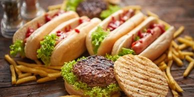 Our Gourmet Burger & Hot Dog selection, featuring 6oz Aberdeen Angus beef Burgers served on a brioche bun with a selection of Cheddar, Jack or Chilli cheese slices. Indulge in tempting toppings like bacon and chorizo, alongside Pork jumbo Sausage and Wild boar hotdogs. Vegan-friendly options include our Gourmet falafel burger. Accompanied by chips, a refreshing crunchy slaw, and fresh salad garnish.