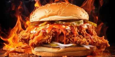 Crispy flammin' chicken served on a seeded bun with cheddar cheese, lettuce, tomatoes, and onion. For our vegetarian and vegan guests, we offer the Halloumi Burger with chilli jam. Served with a side of chunky chips and slaw and a selection of condiments.