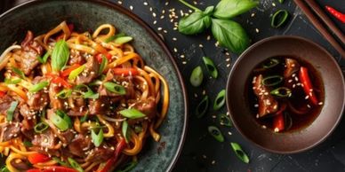Experience our Oriental Noodles, featuring stir-fried egg noodles and bean sprouts with mixed vegetables. Served with a side of prawn crackers and a spring roll. Choose three options, Beef & green pepper with black bean sauce, Beef hoisin, Sweet & sour pork, chicken, or tofu (veg & vegan option), Chinese chicken curry, pork curry, or vegetable curry, Ginger & chilli chicken, or Ginger & chilli (V)